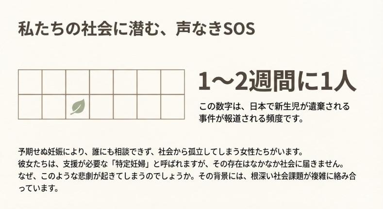 日本では「1〜2週間に1人」の割合で、生まれてすぐの赤ちゃんが遺棄されたり、命を奪われたりする事件が報道されています。彼女たちが「そうせざるを得なかった」背景には、私たちが想像する以上の孤独と絶望が横たわっているのです。