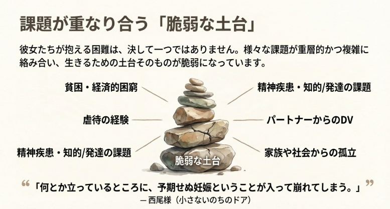 課題は「予期せぬ妊娠」だけではありません。精神疾患、貧困、虐待など、彼女たちは元々、脆弱な土台の上でギリギリ立っている状態です。そこに妊娠という出来事が重なり、一気にバランスを崩してしまうのです。